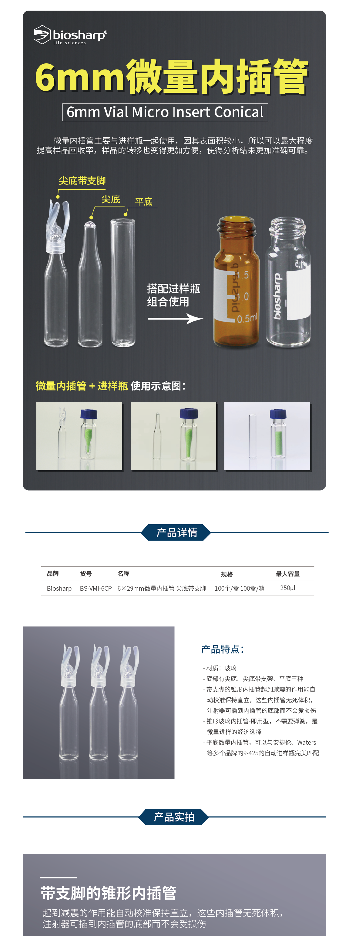 进样瓶微量内插管,尖底带支脚