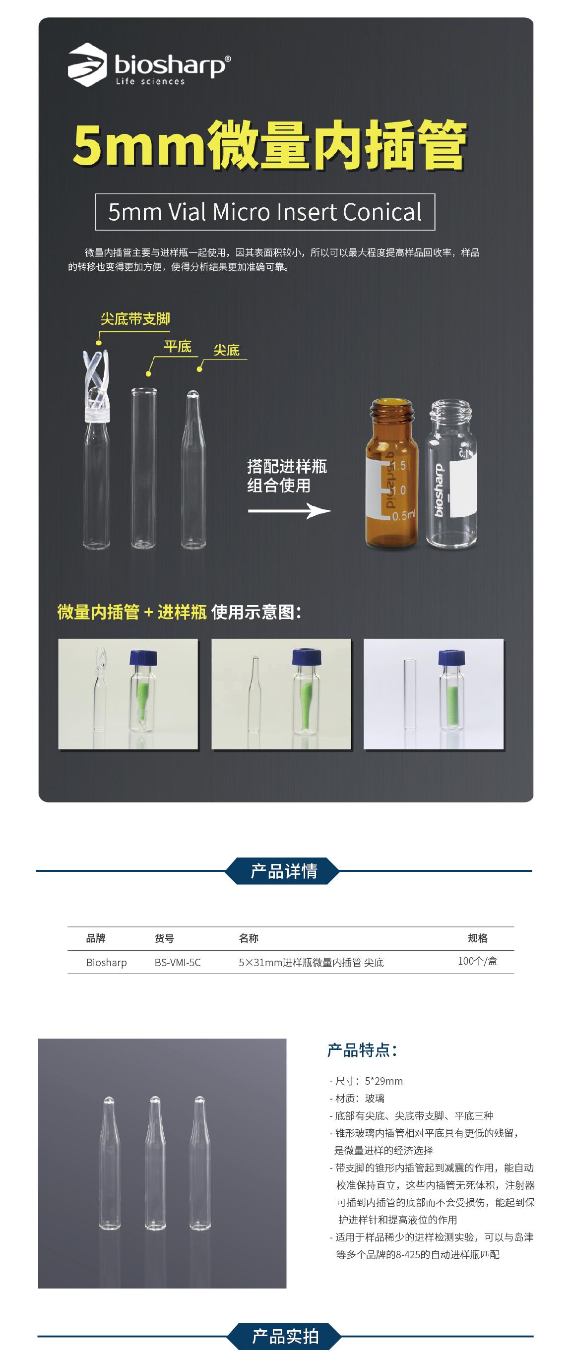 进样瓶微量内插管,尖底带支脚