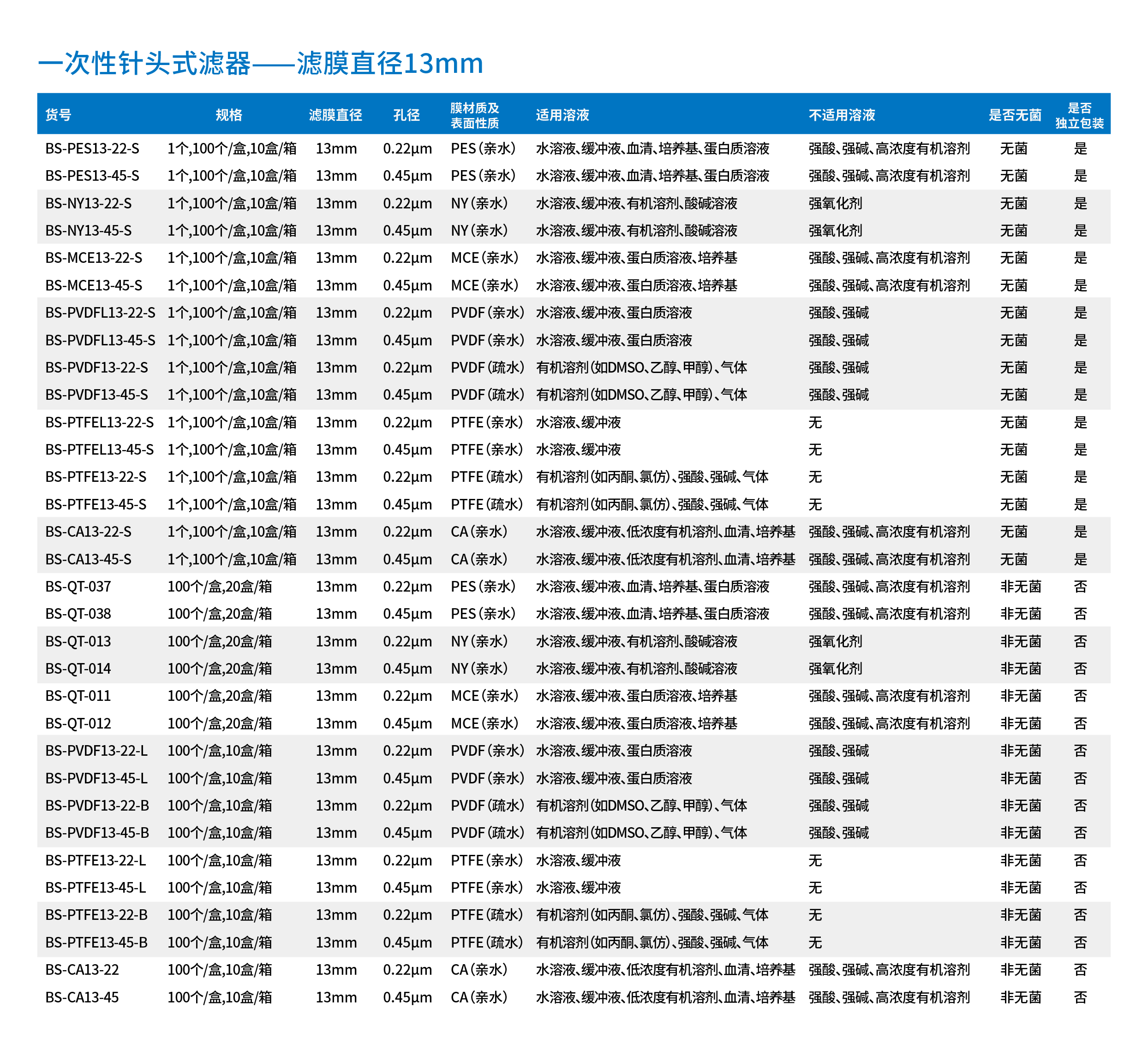 13mm,0.45µm一次性针头式滤器,无菌独立包装,疏水PTFE膜