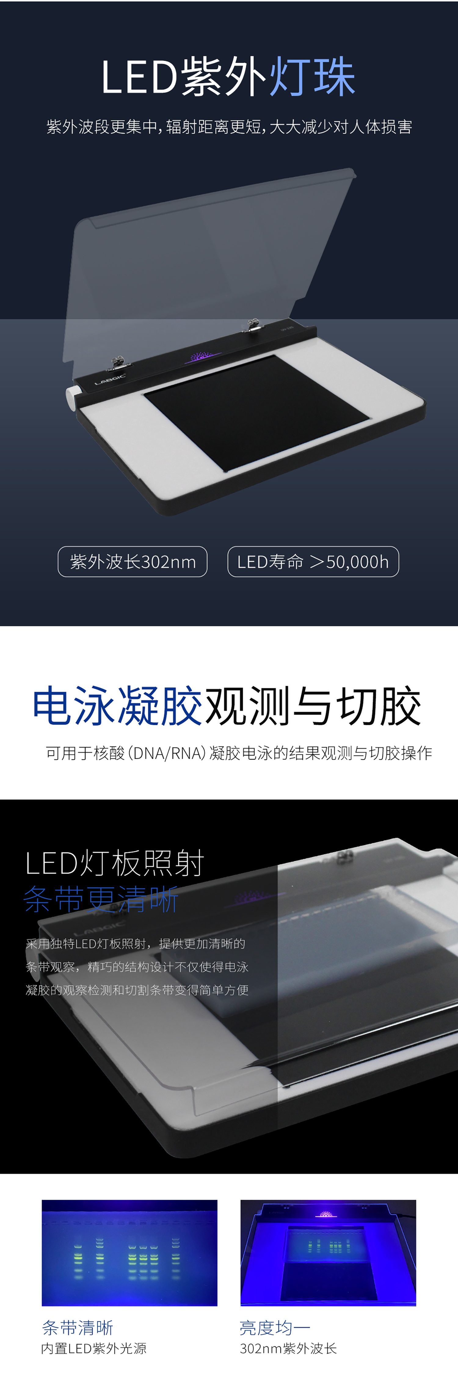 302nm LED紫外透射仪可用于核酸(DNA/RNA)凝胶电泳的结果观测与切胶操作。采用独特LED灯板照射,提供更加清晰的条带观察,精巧的结构设计不仅使得电泳凝胶的观察检测和切割条带变得简单方便,还能够最大程度的降低紫外线对操作人员的伤害。302nm紫外波长能够最大程度地激发荧光染料/DNA复合物产生荧光,灵敏度高,观测条带清晰,光照强,亮度均一,并配以对特定波长UV具有选择吸收能力的特殊紫外滤光玻璃,有效保证激发灵敏度。